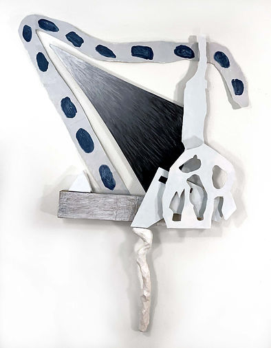 Exhumation/Losing Balance, acrylic, wood, acrylic yarn, papier mâché, canvas , 76 x 41 x 6 inches, 2023